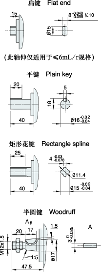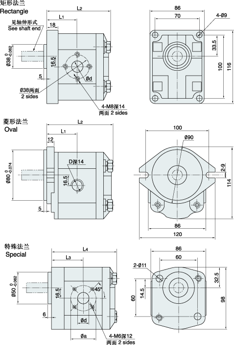 ① 產(chǎn)品代號 ② 壓力等級 E:16MPa F:20MPa ③ 齒輪模數(shù) 3 ④ 公稱排量 (mL/r) ⑤ 安裝形式 A: 菱形法蘭 C: 矩形法蘭 T: 特殊法蘭 ⑥ 油口形式 F: 法蘭聯(lián)接 L: 螺紋聯(lián)接 ⑦ 軸伸形式 P: 平鍵 H: 矩形花鍵 Z: 半圓鍵 B: 扁口鍵 ⑧ 旋 向 L: 左旋 (逆時針) R:右旋 (順時針)(省略)